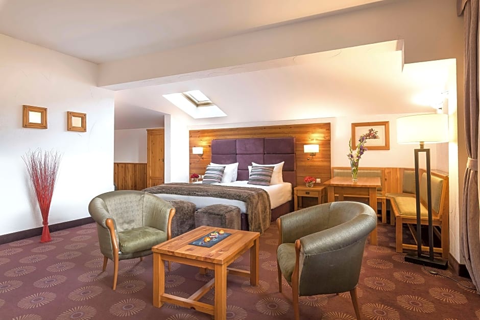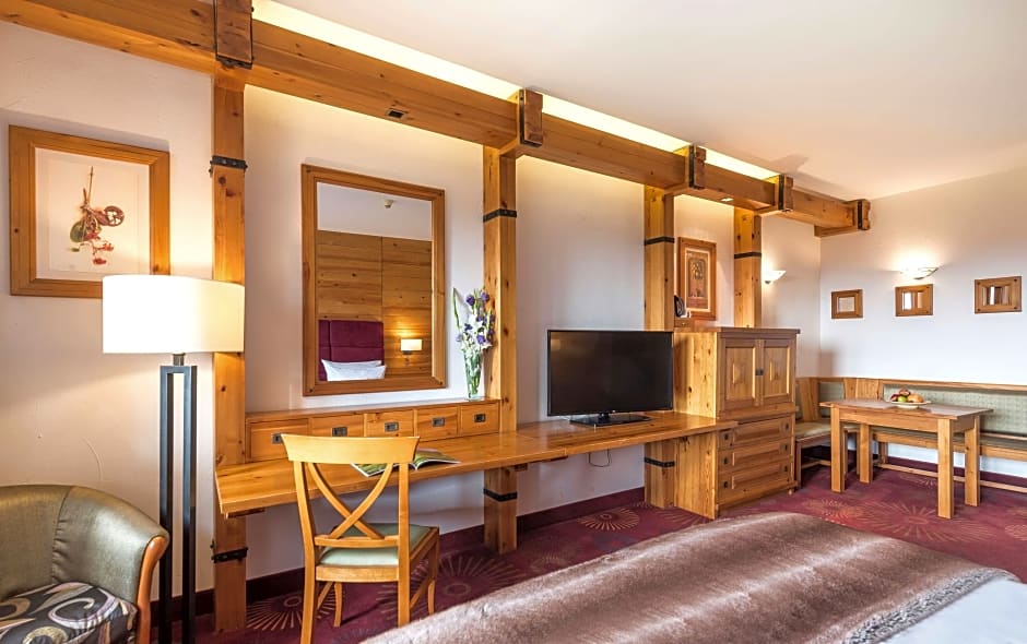 Alpine suite town view is 54 square feet and includes a double bed 131-150 width plus balcony, extra beds on demand, desk, cable tv, hairdryer, tea and coffee making facilities , safe, bathrobes, and slippers and is Wheelchair-accessible.